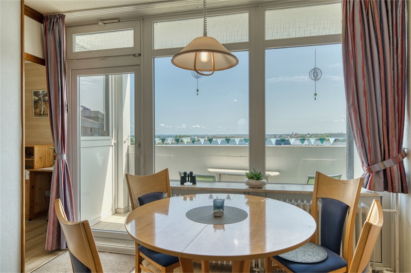 Aus dem 10. Obergeschoss genießen Sie einen atemberaubenden Blick über ganz Heiligenhafen – inklusive Sonnenfunkeln auf dem Wasser.